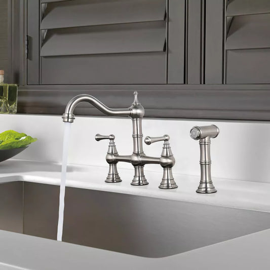 WOWOW Double Handle Bridge Kitchen Faucet with Side Sprayer in Brushed Nickel
