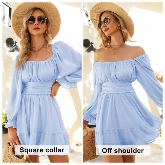 EXLURA Women's 2025 Casual Long Lantern Sleeve Dresses Square Neck Ruffle Tie Back Elastic Waist Aline Short Mini Dress